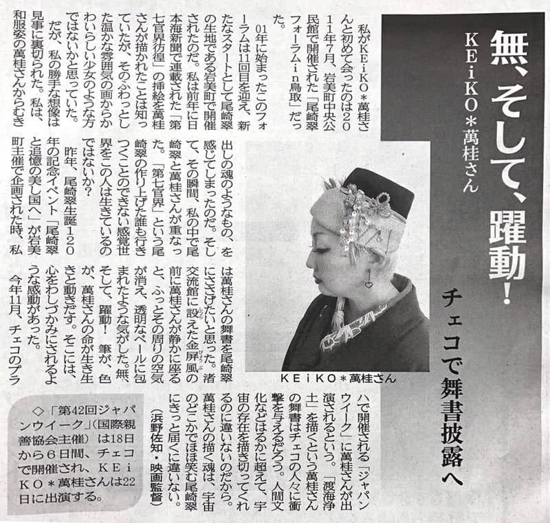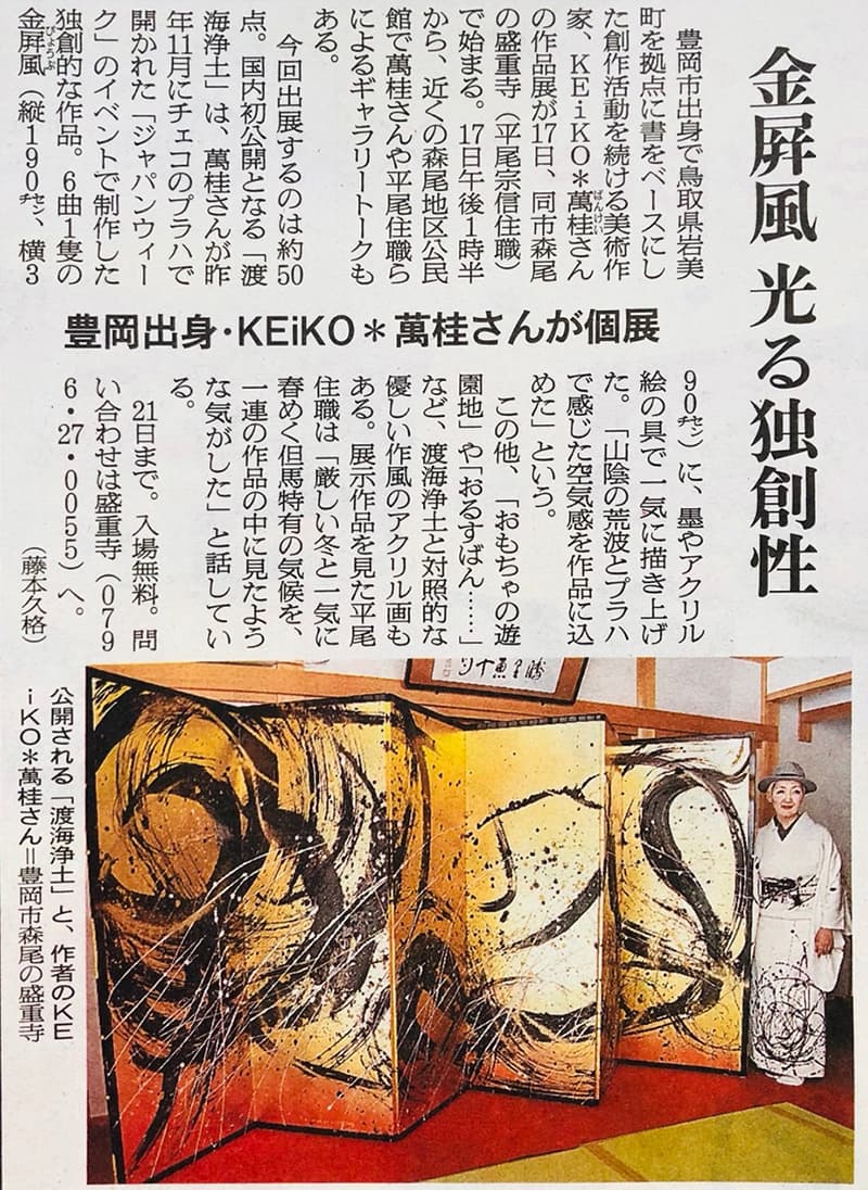 | 2012年1月2日 | 日本海ケーブルネットワーク 「時代をこえてつながる二人の女性アーティスト 尾崎翠とKEiKO*萬桂」 1月2日・3日 <連日放送> 尾崎翠ゆかりの地をたずね、ご親族や鳥取大学北川准教授と対談をおこないました。 三徳山での舞書やアトリエでの作品をつくる様子、インタビューなどの1時間番組です。 |