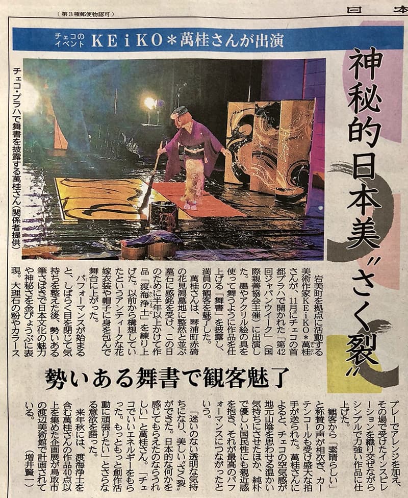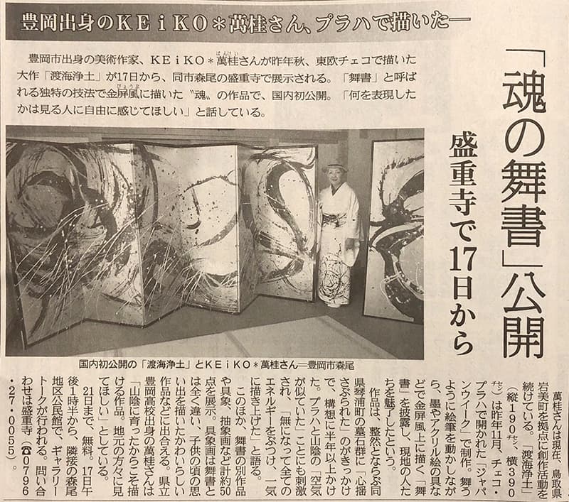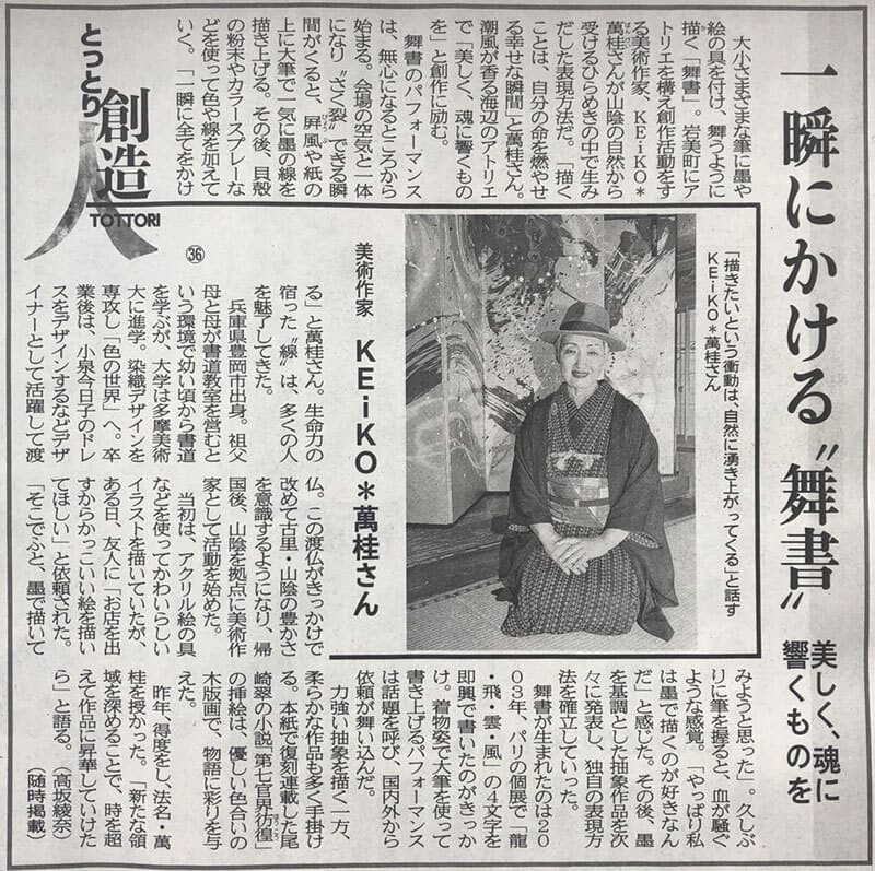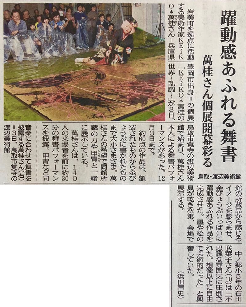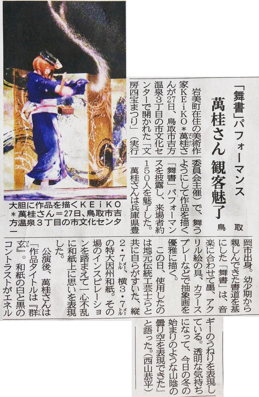 | 2013年1月30日 | 日本海テレビ everyスペシャル 「鬼女 KEiKO*萬桂 〜山陰の息吹を筆に託す〜」 1月30日 <PM5:23〜5:53 放送> 三徳山での奉納舞書から2年あまりにわたっての追跡取材のドキュメンタリー番組です。 出石城跡での舞書まで、イベントのたびに追いかけて取材して頂きました。 アトリエでの暮らしぶり、ご近所のみなさんとのふれあいなど、新たな収録もあわせて30分のドキュメンタリー番組として放送されました。 |