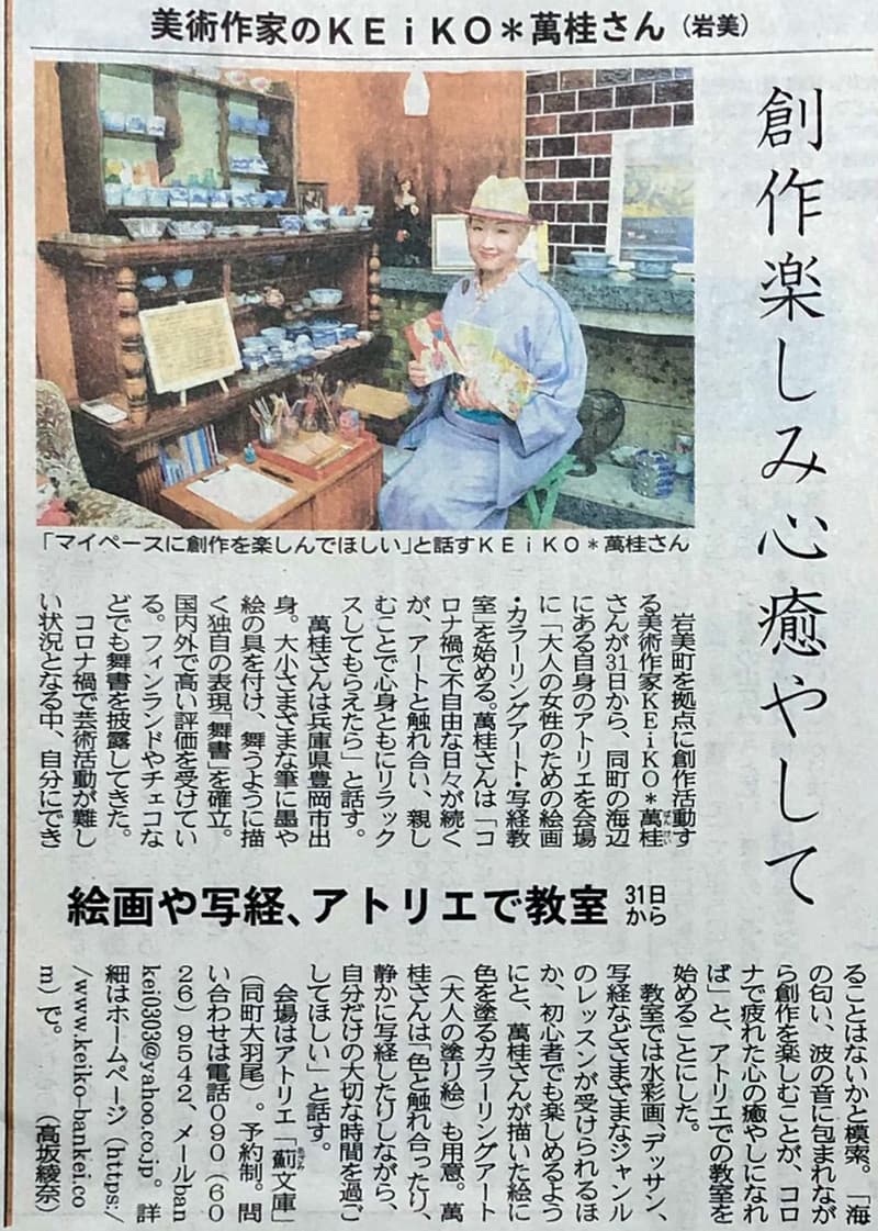 | 2012年7月11日 | 日本海テレビ every日本海 「鬼女・美術作家の思い」 7月11日 <PM6:15〜 放送> アトリエとMORIでの舞書を取材して頂きニュースの中で取り上げて頂きました。 |
