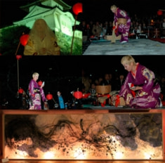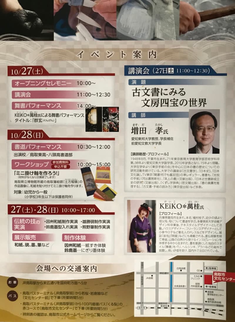 『萬桂舞書』パフォーマンスのDVDや作品のスライド、町並みに飾る作品をみていただきながらお話をします。