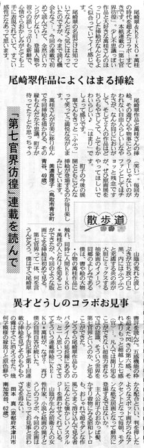 | 2010年10月15日 | 日本海新聞・大阪日日新聞に、尾崎翠の代表作 【第七官界彷徨】復刻連載されることになり挿絵の依頼を受ける事となりました。 予告記事はこちら |