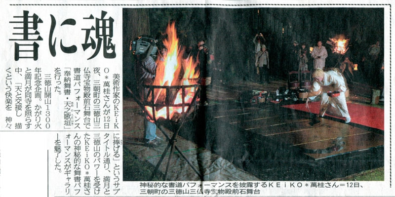 | 2013年1月30日 | 日本海テレビ everyスペシャル 「鬼女 KEiKO*萬桂 〜山陰の息吹を筆に託す〜」 1月30日 <PM5:23〜5:53 放送> 三徳山での奉納舞書から2年あまりにわたっての追跡取材のドキュメンタリー番組です。 出石城跡での舞書まで、イベントのたびに追いかけて取材して頂きました。 アトリエでの暮らしぶり、ご近所のみなさんとのふれあいなど、新たな収録もあわせて30分のドキュメンタリー番組として放送されました。 |