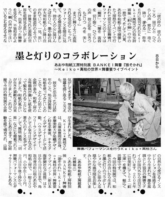 | 2012年9月17日 | 日本海ケーブルネットワーク NCNピットステーション 「大判手すき和紙に舞書パフォーマンス」 9月17日〜18日 <PM7:00〜 放送> あおや和紙工房で、2012年9月16日に行った企画展でのメインイベント舞書パフォーマンス |