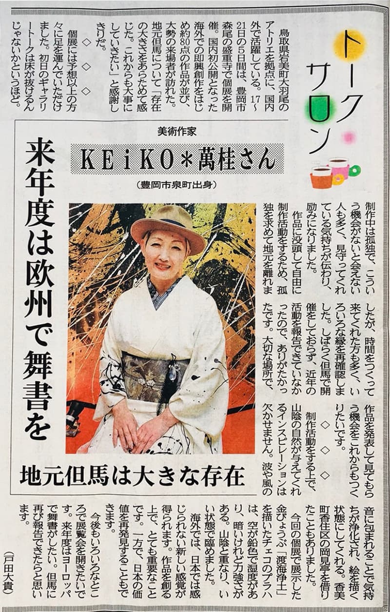 | 2012年1月2日 | 日本海ケーブルネットワーク 「時代をこえてつながる二人の女性アーティスト 尾崎翠とKEiKO*萬桂」 1月2日・3日 <連日放送> 尾崎翠ゆかりの地をたずね、ご親族や鳥取大学北川准教授と対談をおこないました。 三徳山での舞書やアトリエでの作品をつくる様子、インタビューなどの1時間番組です。 |